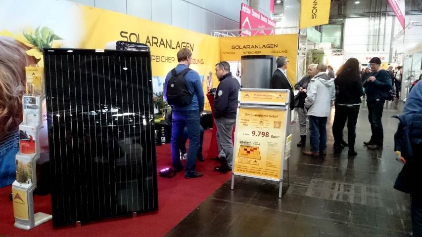 Ein Blick in die Halle zeigt einen traurigen Trend - es sind kaum noch Solaraanbieter vorhanden, welche das Stromthema behandeln. Bereits letztes Jahr war es dünn, doch dieses Jahr sind weitere 5 Stände verschwunden, gerade mal ein neuer Akteur ist hinzugekommen. Insgesamt gibt es außer uns nur noch 6 weitere Stände, welche Photovoltaik thematisieren - das jedoch eher sehr lieblos am Rande. Darunter ein Baumarkt und zwei Solarthermieanbieter. Unterm Strich ist das natürlich für uns eher gut, für die Solarbranche als solche jedoch nahe an einer Katastrophe - ein Sinnbild für den politisch gewollten Niedergang einer Zukunftsbranche. Gerade mal 3 Jahre ist es her, da war die Halle voll mit Solarteursständen. Nun... die Sonnenplaner stehen und wanken nicht! Wir bieten weiterhin einen Platz an der Sonne. Mit Erfolg - dieser Abschlusssonntag, war der zweitbeste Tag der gesamten Messe.