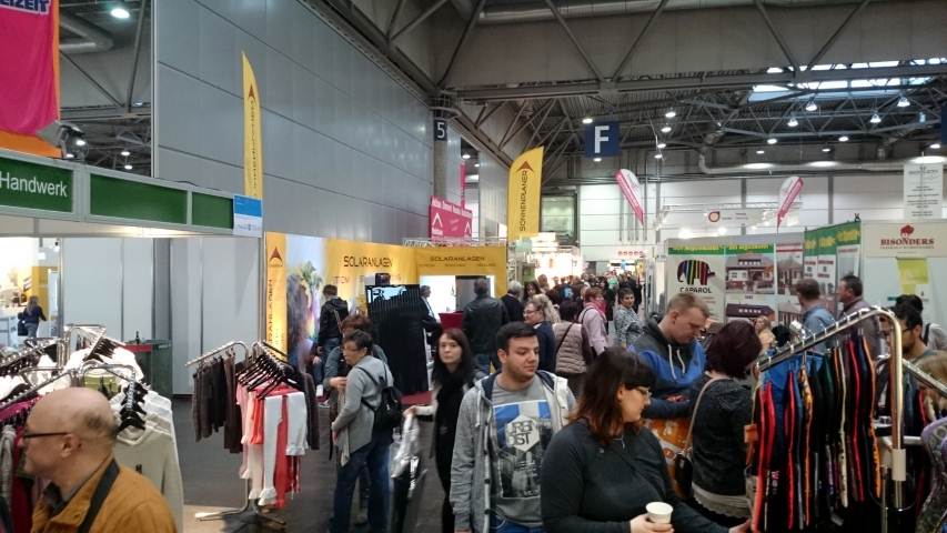Am Stand: schnell durchgesaugt, Beamer installiert, angefangen Prospekte mit unseren Aufklebern zu bekleben, dann ertönt schon der Gong und die Messebesucher strömen in die Halle. Das Wetter ist kühl aber sonnig. Scheinbar genau richtig fürs Messegucken, denn der Besucherstrom ist ordentlich.